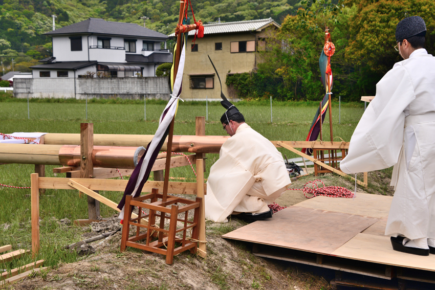 兵庫県神社庁姫路支部の神饌田(打越)で、伊勢神宮より内宮の摂社「津長神社」の鳥居古材を拝領し「鳥居奉建祭」が行われました。